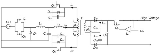 A four-stage DC/DC high-voltage converter is proposed in this paper, with the topology of the schematic circuit depicted in Figure 3.