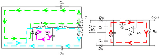 When and are both turned off, the equivalent circuit diagram is shown in Figure 4. On the primary side, part of the energy in charges the capacitor , while the other part flows through , , , , and sequentially, and then returns to . On the secondary side, the current flows through , , , and to form a loop. There is no energy exchange between the primary side and the secondary side. In Figure 4, the green, blue, and purple arrows indicate the direction of current flow on the primary side, the red arrows indicate the direction of current flow on the secondary side.
