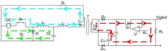 The equivalent circuit diagram when is turned on is depicted in Figure 7. In Figure 7, the green and blue arrows indicate the direction of current flow on the primary side, the red arrows indicate the direction of current flow on the secondary side.