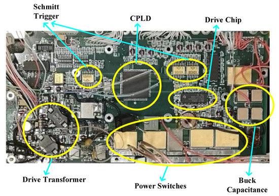 A laboratory prototype of the four-stage converter was fabricated, as shown in Figure 9. There are four power switches in the converter, with two switches used as interleaved dual-driver in the buck circuit and the other two switches used in the push–pull circuit. The main uses of Schmitt triggers are waveform shaping, transformation, comparison, etc. All of the control signals are processed in CPLD.