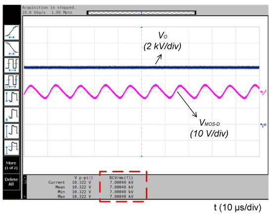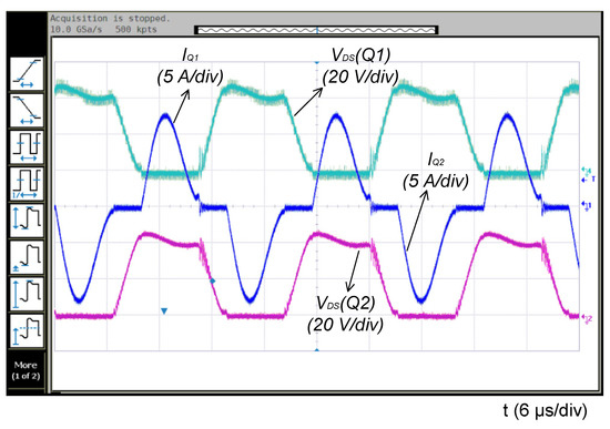The voltage and current waveforms of the second-stage push–pull switches of the prototype are presented in Figure 10.