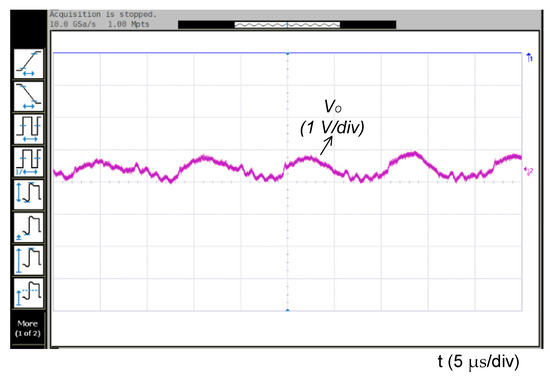 Figure 14 shows the efficiency test of this four-stage converter. In Figure 14a, with a full load, the efficiency is tested at different bus input voltages, which indicates that the lower the bus input voltage is, the higher the potential efficiency. The bus voltage on a satellite is usually 25~40 V DC, and the efficiency of this four-stage converter can reach 94.5%. In addition, Figure 14b shows the efficiency results for different loads when the input voltage is 25 V, with the graph suggesting that the heavier the load, the higher the efficiency.