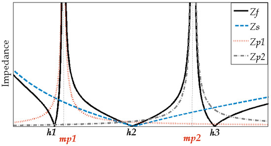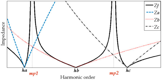 The TASTF impedance characteristic is illustrated in Figure 2. The impedance of the filter will be zero at the tuning frequencies ωra, ωrb, and ωrc in order to eliminate these harmonics. At the same moment, the impedance value at the parallel frequencies ωp1 and ωp2 will reach a maximum value. The parallel frequencies are represented as a function of the fundamental frequency.