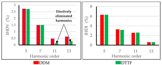 Figure 12. The system’s individual load voltage and current harmonics using DTTF compared with DDM in [8].