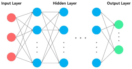 ANNs are computational systems inspired by the structure and function of neurons in the human brain [34]. The most common form of ANNs is a multilayer feedforward architecture comprising an input layer, one or more hidden layers, and an output layer, as illustrated in Figure 4. In this figure, the red, blue, and green nodes represent the input, hidden, and output layers, respectively.