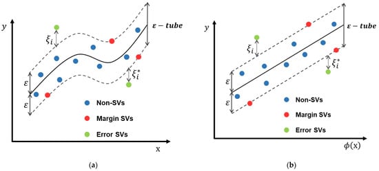 A structure of one-dimensional support vector regression. (a) Before mapping the dataset into a higher-dimensional feature space. (b) After mapping the dataset into a higher-dimensional feature space.