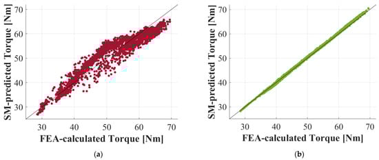 Based on the results in Section 5.1, Kriging was identified as the most accurate surrogate modeling technique among the three methods and was used to construct the SMs. Figure 11a,b show the distributions of individual non-dominated designs and the Pareto fronts calculated during each FEA-based and SM-based optimization process, respectively, confirming that there is excellent agreement between the two results. The Kriging-based SMs for the two objective functions were trained using 250 FEA data samples per SM, and their hyperparameters were tuned using Bayesian optimization, as described in Section 4.2.