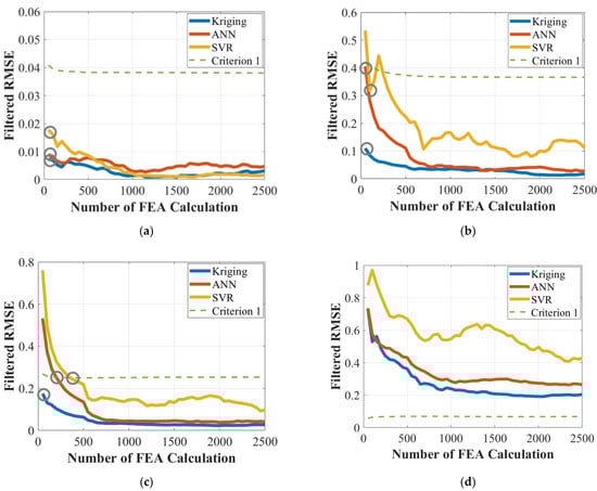 Figure 9a–d shows the trend of the filtered RMSE values of three SMs, Kriging, ANN, and SVR, for each objective function according to the number of FEA calculations. Figure 9a shows that the total machine mass was well predicted using a relatively small number of FEA calculations, regardless of the SM type. This is because the change in total mass is not very sensitive to most design variables, except stack length. The predicted results of all SMs meet the first stopping criterion with only 50 FEA calculation results. In contrast, most design variables, particularly rotor variables, show higher sensitivity to AMC and average torque, so more FEA calculations are required to complete SM training and meet the stopping criterion. As shown in Figure 9b,c, it took no more than 350 FEA calculations to train the SMs to predict AMC and average torque with adequate accuracy.