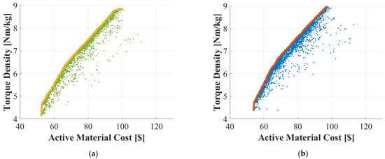 In this section, the results of design optimization based on FEA and those using surrogated-assisted optimization are compared. The same design variables and conditions as in Table 1, as well as the objective functions of AMC in dollars and torque density in Nm/kg, are considered. The defined prices of each active material are 118 USD/kg for magnet, 9.4 USD/kg for copper, and 2.4 USD/kg for iron. For the optimization problem, 100 generations with a population size of 50 per generation, a crossover probability of 0.9, and a mutation probability of 0.05 were chosen.