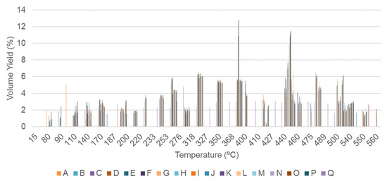 Figure 3 represents the volume yield as a function of the true boiling point (TBP) for the 17 samples (A to Q).