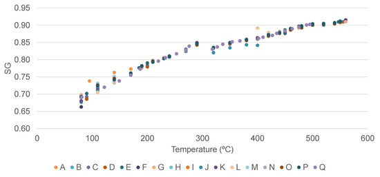 Figure 5 represents the specific gravity for each fraction as a temperature function.