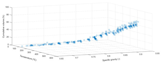 For these waxy crude oil samples, it is possible to obtain Equation (2), which defines the cumulative volume as a function of the TBP with an R-squared value of 0.9801.