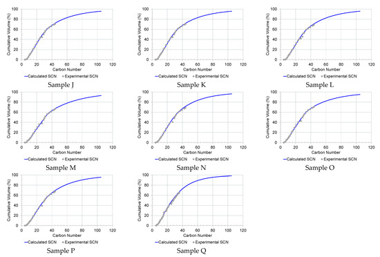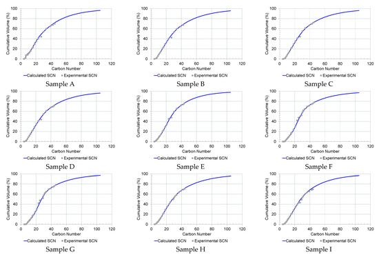 Figure 8 shows the adjustment of the input values and the values calculated by the software, illustrating the cumulative percentual volume as a function of the single carbon number (SCN).