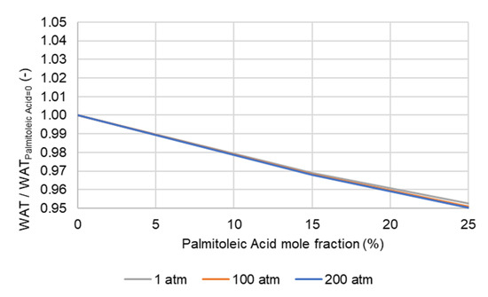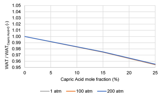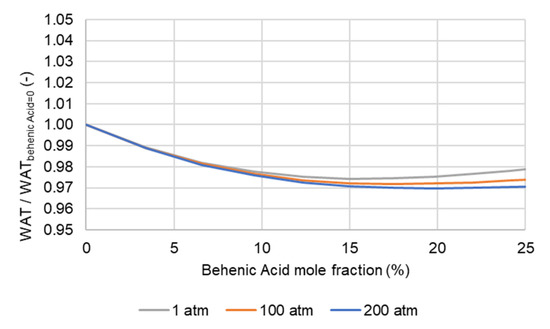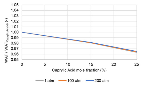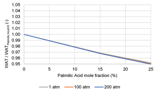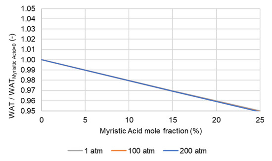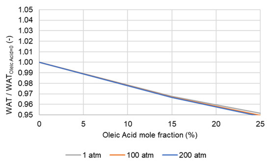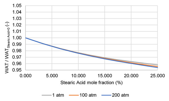 As it is possible to observe, myristic acid (C14:0), oleic acid (C18:1), palmitic acid (C16:0), or lauric acid (C12:0) revealed a higher impact on the WAT reduction. The maximum reduction was achieved for , which means that for crude oil sample A, for instance, the WAT is expected to decrease from 59.87 °C to 56.89 °C (@ 1 atm) when myristic acid is added at 25% mole fraction.