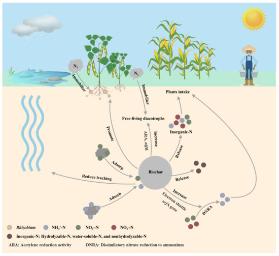 Biological N2 fixation (BNF) is a complementary N source for plants, and symbiotic bacteria contain the nitrogenase enzyme [113]. Generally, BNF consists of two primary pathways: symbiotic and free-living [114]. The positive effect of biochar toward stimulating BNF was more pronounced in the symbiotic relative to the nonsymbiotic BNF (35.8 vs. 28.1% increment over the control) [115]. Symbiotic N2-fixation (SNF) occurred via a molecular “crosstalk” between plants (only limited to leguminous crops) and the N2-fixing symbionts in plant roots [116]. Many kinds of literature have reported that BNF was enhanced with biochar supplement [94,95,96,97] (Figure 1). Azeem et al. [94] applied sugarcane bagasse biomass and pyrolysis at 350 °C in mash bean plots with the application rate of 10 t ha−1. An 83% increase in N2 fixation was found compared with the control treatments. The selection of suitable biochar according to the types of soils and plants can promote the BNF in root nodules or by association with free-living bacteria [117]. Horel et al. [118] also exhibit that biochar amendment contributes to improving the microclimate of microbial growth, which might lead to a significant decline of soil N, but a significant increase in N2 fixation rate in alder. Based on the results obtained by Anderson et al. [119], the population of N2 fixing microorganisms, i.e., Frankiaceae and Bradyrhizobium, increased with biochar supplement. A pot experiment with clay loam soil was carried out by Rondon et al. [120], and 31% greater N2 fixation by Rhizobium strains associated with bean plants was found with wood biochar amendment. On the other hand, free-living N2-fixation (FNF), carried out by cyanobacteria in association with moss or other free-living diazotrophs in litter and soil, is nearly ubiquitous in terrestrial ecosystems [121]. Biochar with a 2% application rate significantly increased acetylene reduction activity (ARA) and nifH abundance in 56 days. Through the analysis of soil diazotrophic community composition, Azotobacter, Bradyrhizobium, and Skermanella were the most dominant genera. Azotobacter, a free-living diazotroph, reached the maximum in soil [99] (Figure 1). The variation in the diazotrophic community was associated with soil EC, DOC, and pH [99]