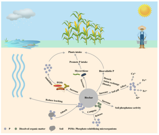 Numerous studies have shown that the application of biochar has led to an increase in soil available P via different mechanisms (Figure 2). (1) The biochar can release the bioavailable P to the soil due to desorption, anion exchange, or dissolution [127]. (2) Soil P complexation was influenced by biochar addition, mainly by modifying soil pH. Gao et al. [16] showed that the precipitation of P with Ca2+, Fe2+, Fe3+, and Al3+ was affected by altering soil pH and activities of these cations. (3) The dissolved organic matter (DOM) released from biochar resulted in competition with P for sorption in soil and led to the increase of P release [24,132]. (4) Biochar promoted the available soil P by improving soil phosphate-solubilizing microorganisms (PSMs) biomass. In soil, PSMs are consistent with P-solubilizing fungi, P-solubilizing bacteria, and actinomycetes which can solubilize the P [133,134]. Jaafar et al. [135] reported that biochar gave PSMs a suitable habitat. Zheng et al. [136] indicated that the survival rate of PSMs and the available P content in biochar-emendation soil were higher than in the control. In addition, biochar can promote the P uptake by plants via the increase of mycorrhizae [137]. (5) Soil phosphatase activity was a significant influencing factor of available soil P with biochar application. Jin et al. [36] found that alkaline phosphomonoesterase increased by 28.5% in clay-loam soil and 95.1% in silt loam soil with manure biochar supplement. To sum up, the application of biochar to enhance the available P is mainly by decreasing the complexation of P with soil components and promoting the P metabolism of soil.