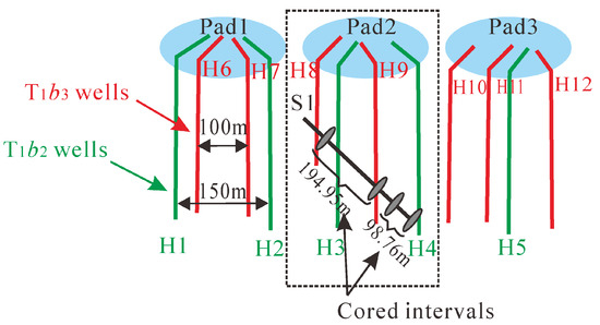 The CHFTS is a hydraulic fracturing test site located in the Junggar basin. Figure 1 shows a plan view of the slant core well trajectory and the adjacent producing horizontal wells. The test site contains twelve producing horizontal wells and a slant core well referred to as S1. Seven adjacent horizontal wells were drilled in the upper T1b3 formation and five wells were drilled in the lower T1b2 formation. The slant core well (S1) was drilled from northwest to southeast with an azimuth of 175.0° and an angle of inclination of 80.3°. The first cored interval recovered 194.95 m of core involving the fractures of wells H8/H9 in the T1b3, and the second cored interval recovered 98.76 m of core involving the fractures of well H4 in the T1b2.