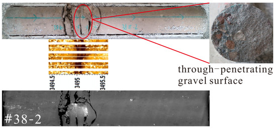 Figure 2 shows the features of a hydraulic fracture; the fracture morphology features contain straight, microwave and crushed zones [18]. The fracture profile is incomplete and mostly gravel scattered. The fracture surfaces have through-penetrating gravel and bypassing gravel patterns. The fractures are filled with materials including mud and proppant. Combined with FIM imaging logging, most hydraulic fractures are high angle fractures and high conductivity fractures.