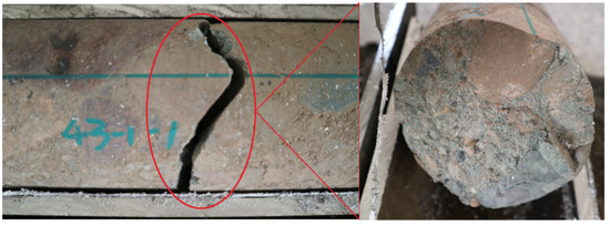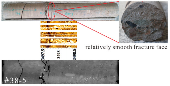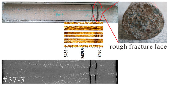 A drilling-induced fracture is shown in Figure 7. The fracture is irregular serrated or microwave in morphology, and the fracture profile is complete. The fracture surfaces have a bypassing gravel feature with an uneven small amount of mud adhesion. Drilling-induced fractures of the cores could not be observed in FIM imaging logging, but could be observed in core CT scans.