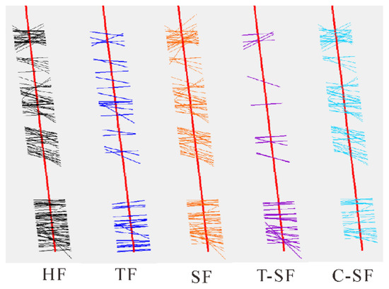 Figure 10 shows the core fractures along the coring trajectory. In 293.71 m cores, for grade-1 fracture classification, approximately 214 hydraulic fractures, 90 drilling-induced fractures and 48 core cutting-induced fractures were identified. For grade-2 classification, hydraulic fractures were divided into 47 tensile fractures and 167 shear fractures. For grade-3 classification, shear fractures were subdivided into 45 tensile-shear fractures and 122 compression-shear fractures. Vertically, the hydraulic fractures in the cores were distributed in the range of 11.5 m above and 14.6 m below the wellbores of the adjacent producing horizontal wells. Horizontally, hydraulic fractures propagated within 100 m from the well spacing, as shown in Figure 11.
