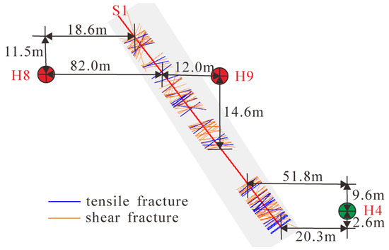 - According to the fracture classification results in this study, the tensile fractures were mainly in the near-wellbore area with lateral distances of less than 20–25 m from the wellbore. The shear fractures were mainly in the far-wellbore area with lateral distances of 20–30 m from the wellbore.