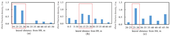 The distribution of shear fracture density with respect to the lateral distance from adjacent wells. (a) H8; (b) H9; (c) H4.