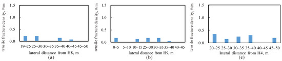 The distribution of tensile fracture density with respect to the lateral distance from adjacent wells. (a) H8; (b) H9; (c) H4.