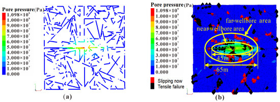 The fracture configuration, including the distribution of fracture pore pressure and the stress state at the failure node, is illustrated in Figure 15a,b; fractures are colored according to the pore pressure and the stress state at the failure node is marked. Tensile failure nodes are shown in black, and shear failure nodes are shown in red. The results of numerical simulation were consistent with those of core fracture classification, which verified the rationality and accuracy of the core fracture classification. In the near-wellbore area less than 20–25 m from the injection point, a low stress difference and high pore pressure were more conducive to tensile failures. In the far-wellbore area, multiple shear failures were generated through interaction with the natural weak plane under a high dynamic stress difference. Eventually, multiple shear failures formed a high fracture density area within a range of approximately 20–30 m from the injection point. During hydraulic fracturing, due to a propped fracture network created close to the well, the minimum stress increased. In the pressurized zone in advance of the propped zone, the effective stresses were low. Thus, shearing happened at low effective normal stress.