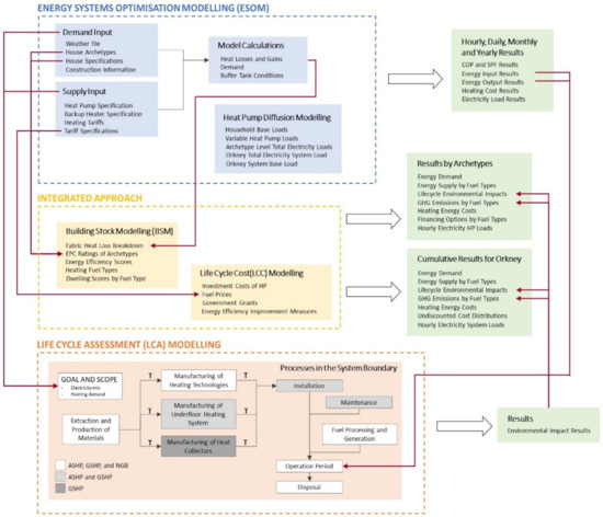 Integration of LCA and ESOM methods was investigated in the literature [14,15,16,17,18]. Most of the studies focused on the environmental impacts (mainly GHG emissions) of energy production technologies on a larger scale at the supply side of the system [17,18]. Some studies focus on individual low-carbon heating technologies [15,16] without assessing overall impacts. The lack of a methodological approach which does not accommodate system thinking creates difficulties between actors and the consistent development of circular practices. On the other hand, national targets on decarbonizing heating require strong commitments in terms of electrification of heating by heat pumps and energy efficiency improvements of houses. However, a holistic approach considering the end-user side by investigating archetype-level savings and system thinking with achieving macro-level targets is needed. This research advances the current literature of specialty by combining LCA with ESOM, considering a number of archetypes for the building stock and assessing the impact of ASHP at the macro level (in this case Orkney).