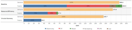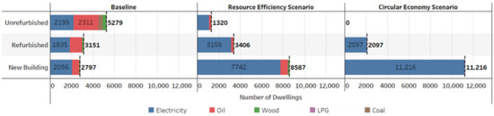 Resource Efficiency (RE) Scenario: A reduction in energy demand is expected but this decrease is lower than the CE scenario. EEI applications are limited. RE scenario assumes that 75% of fossil fuel heating technologies will be replaced with heat pumps. EEI measures are taken for 75% of unrefurbished and 25% of refurbished houses. Half of the new dwellings constructed before 2050 are assumed to be in the new building category and those remaining are in the refurbished category, all of which use heat pumps for space heating.