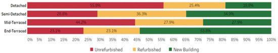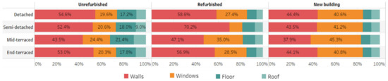 Heat losses occurring in the building fabric are calculated by the energy model described in Section 3.2 for different construction types (walls, windows, floor, and roof) to explore the impacts of individual construction elements on fabric heat losses (FHL). Results for four different archetypes (detached, semi-detached, end-terraced, mid-terraced) with three different specifications (unrefurbished, refurbished, new building) are investigated. The results illustrate that walls are the main contributors to FHL overall with 51.9% followed by windows, floor, and roof with 26.9%, 13.3%, and 7.9 respectively (Figure 3). However, windows contribute more to a mid-terraced new building because the area of the exposed wall is smaller, and the wall is highly insulated. The contributions are varies depending on the house specification. The impact of walls and floor reduces when the house becomes more insulated, i.e., the impact of windows increases.