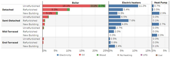 After identifying the housing stock condition, the current heating situation of Orkney is explored. The main heating type in Orkney is electric heaters with 45.2% of the total housing stock (Figure 5). It is followed by oil boilers and heat pumps with 36.7% and 9.0%. The remainder is provided by wood, coal, and LPG boilers. The majority of heat pumps are used in the new building category with 7.7%.