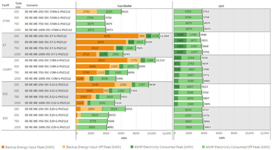 The amount of energy produced by the heat pump and backup heater varies between 16,500 and 17,500 kWh based on TES tank sizes. Figure 6 illustrates the energy input for optimisation scenarios for the heat pump and boiler. When the gas boiler is used as a backup heater, Standard tariff results show the lowest energy consumption values because the heat pump is running at full capacity assuming that there is no peak or off-peak time tariff, so the gas boiler usage is minimised. The boiler is only running when the tank size is 250 L. Even though the consumption figure is 6015 kWh with a 250 L tank size, energy input values occur as 3794 kWh, 3879 kWh, and 3973 kWh for larger tank sizes respectively. The 250 L tank size is not enough to replace the gas boiler in the Standard tariff. E20 tariff results show similar but slightly higher results than the Standard tariff. The consumption increases to 6553 kWh with 250 L tank size. However, when the tank sizes increased, the consumption figures decreased in the E20 tariff. So, increasing the tank size has a positive impact on this tariff.