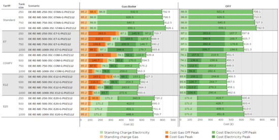 A refurbished detached house with a mediumweight thermal mass construction material and PUZ112 heat pump type with 35 °C flow temperature is selected as the baseline scenario. As the water flow runs in low temperatures, the stored water will be heated to 60 °C one hour once a week to avoid legionnaires’ disease based on HSE [61] guidance. Five types of tariffs (Standard, E7, Comfy Heat, E12, and E20) and four tank sizes (250 L, 500 L, 750 L, and 1000 L) are compared with two different settings (Gas boiler as a backup heater and no backup heater) for the optimisation.