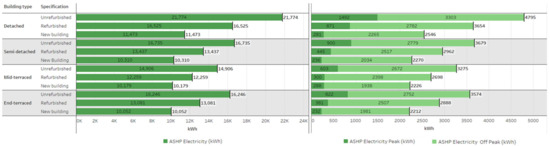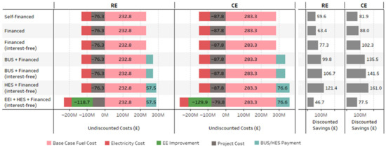 The Boiler Upgrade Scheme (BUS) replaces the Renewable Heat Incentive (RHI) and provides a grant of £5000 for the upfront cost of an ASHP [53]. Similar to this support, the Scottish Government provides a loan for EEI measures and renewable heating systems, including cashback payments [8]. The government can provide a £2500 interest-free loan and £7500 cashback (£10,000 in total) for an ASHP installation. The unrefurbished, detached house is the only category which has more than £10,000 upfront cost so the interest-free loan is not limited to £2500 in this study for simplicity. These support measures are also included in LCC calculations. The results are expressed in discounted costs at an annual rate of 3.5% [54].
