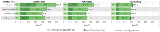 The cost of efficiency improvement steps for each construction element is identified by house archetypes. While deciding on the insulation type, the dominant construction element is selected. The highest installation cost occurs in unrefurbished detached houses with £22,100 followed by semi-detached and end-terraced houses with £16,325 and £15,525 respectively. Mid-terraced houses require less wall insulation area. Therefore, the total cost is relatively low (£9425) when compared with other archetypes. External wall insulation is the major contributor to the costs in all archetypes except mid-terraced houses. Replacing windows dominates the wall insulation in mid-terraced houses as they have less wall area exposed to outside conditions. Refurbished houses also require some improvements to reach the new building category which includes secondary glazing to have higher insulation on windows, drought proofing, and further insulation on roofs and floors. The installations costs for detached, semi-detached, mid-terraced, and end-terraced houses are £9000, £7075, £6675, and £4975, respectively (Appendix C, Figure A3). The efficiency improvement costs are included in the LCC analysis for a broader perspective on the housing stock condition.