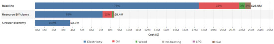 Data for fuel prices of energy sources used in Orkney were collected from previous studies and quotes from suppliers. BEIS [55] provides historical data for fuel prices and future trends. National Infrastructure Commission [56] researched the current fuel prices for the year 2050. With the help of these reports and market research from suppliers, the fuel prices for the baseline scenario, RE scenario, and CE scenario are identified [55,56,57,58]. LPG, oil, coal and wood prices are identified as 6.3 p, 5.2 p, 4.7 p, and 5.3 p, respectively. Standard electricity tariff price is identified as 16.5 p, and Comfy Heat tariff is identified as 8.6 p, 15.7 p, and 20.3 p for off-peak, peak, and standing charge prices (Appendix B, Figure A1). Fossil fuel prices are expected to increase in the future with carbon taxes, and electricity prices to decrease [57].