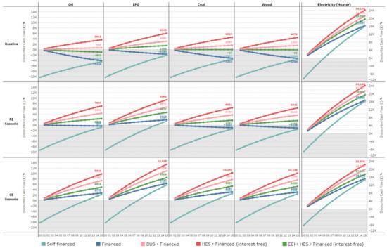 Existing heating fuel types (oil, coal, LPG, wood, electricity), fuel prices, investments costs, discount rate, and lending rate information are included in the model to calculate savings coming from the transition to heat pumps. Different financing alternatives, including support from the government (BUS/HES), are also investigated at both the archetype level and the island level. In this section LCC analysis of a heat pump is calculated based on baseline model results. Then, results for CE and resource efficiency (RE) scenarios are analysed for future results.