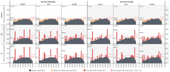 The distribution of off-peak and peak hours during the day was identified according to tariff options. Standard tariff assumes that there is no peak time pricing so standard pricing is assumed as an off-peak tariff. Economy7 tariff assumes 7 h of off-peak time during the night. The number of off-peak hours is very similar in the Comfy Heat tariff with 8 h, but they are distributed throughout the day with 4 h during the night and 4 h during the day. Economy12 and Economy20 tariffs have 12- and 20-h off-peak time with 2 h during the day and the remaining during the night (Appendix B, Table A1).