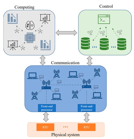 The communication feature consists mainly of equipment for information and data exchange such as terminal equipment, switching equipment and transmission link. The process of exchanging data and information of energy and electricity quantities is of primary interest in the research of CPEPS. The main purpose of communication layer in CPEPS is functionally to realize the measurement data of the energy and power system’s flow and the control of operation equipment on the support of SCADA based on telecommunication control technology to completely receive the energy and power flow data, remotely indication and command, and remotely system adjustment. The remote terminal unit (RTU) at energy and power station and front-end process at the control center play an important role. The RTUs are responsible for collecting operation information of the physical system required from the dispatching center, and then sending it to the terminal processor of the dispatching center in the real-time process []. The front-end processor forward collected information from RTUs to the control center with two functions, computation for decision making and control signal feedback to the physical layers [].