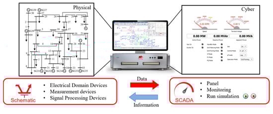 In order to make the simulation behave exactly like real-world circumstances, real-time simulation refers to a model of a physical system that can run at the same speed as actual clock time. Comparing between non-real-time and real-time simulation, there has several research in recent years [,]. The authors in [] proposed several experiments to calculate the time gap from the wall-clock time to verify the real-time behavior of a simulation run. The result in this paper demonstrated the difference in milliseconds between discrete event simulation with real-time simulation. As a result, when applied to the CPEPS sector, real-time simulation may be utilized to assess the dynamic power system by deriving the mathematical expression of numerous events originating in power and information systems. For simulating of CPEPS in real-time, according to [], it was concerned with the creation and deployment of a complete cyber-power test bed comprised of simulation, emulation, and actual devices. Real-time co-simulation necessitates that the simulation software can run in real-time and the model be partitioned into several sub-models for parallel computing. This requires hardware-based real-time power system simulation platforms, such as Real Time Digital Simulator (RTDS) [], OPAL-RT [] and a new developing technology called Typhoon HIL [] with the structure as shown in Figure 6. The real-time co-simulation is expensive and difficult because of hardware requirement; therefore, it is currently being developed and is mostly used for testing and exercising smart grid projects. However, Typhoon HIL developed and established Virtual HIL that is a true enabler or test-driven development processes where supports for users can deploy and run all real-time ready models without any actual hardware devices.