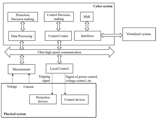- The merged functionality to reduce physical equipment in the power station can be developed in the future. For example, the control devices such as silicon-controlled rectifier (SCR) or DC-AC converters and protection devices such as circuit breaker or protection relays in the power system today are independent and unrelated to each other. These devices’ functionality can be merged on the advancement of ICT, the control center receives data from the physical system, and then makes protection or control decisions. Figure 7 shows the diagram of cyber-physical convergent purpose for protection and control functionalities under ultra-high speed communication.