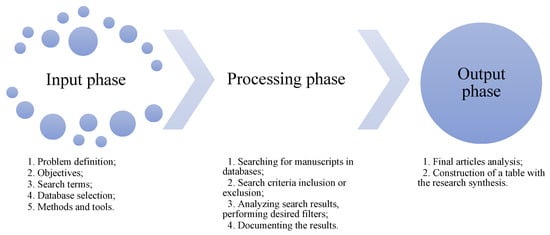 In simple terms, SLR can be defined as a systematic process composed of three phases: input (i), processing (ii), and output (iii) [24,25]; as shown in Figure 1. In the input phase, we define the research problem and objectives. During the processing part, we search for studies in the databases, construct search strings, and define exclusion or inclusion criteria, using which, we then apply filters to assist us in the analysis of results. We then proceed to document the results. In the output phase, we produce tables and figures which summarize the obtained results.