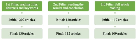 Figure 2 illustrates the delimiting filters of the sample used. In a search carried out in September 2022, the search strings resulted in 202 publications in the Scopus database. After reading the title, abstract, keywords, and search results, we reduced the list to 130 articles, since part of the initial sample was outside the scope of the research. After an initial read of the results and conclusions, we applied the second filter and obtained a sample of 112 articles. Finally, the articles were subjected to a complete reading, and we narrowed down the sample to 109 articles.
