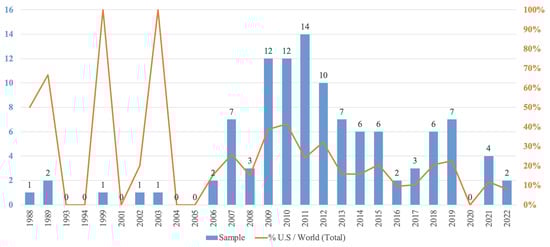 To answer RQ1 (what are the main characteristics of the literature regarding the impact and contributions of ethanol on US retail gasoline prices), we start with the temporal distribution of the articles. Figure 3 presents the annual distribution of articles in the sample. This figure also displays the percentage of the sample in the general literature on the topic, that is, when search string (ii) is removed, without any restriction by country or area (obtaining the ratio of the publications related to the U.S. to the World). It is important to highlight the interest in the subject in the U.S. in comparison to the worldwide literature. Even though we can observe a greater interest in the topic between 2009 and 2012, the following analysis will show that this topic is still very relevant and important to researchers.