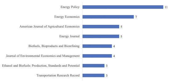 Figure 4 presents the main scientific journals that have at least three articles present in our sample. The journals with the highest number of publications are Energy Policy, Energy Economics, and the American Journal of Agricultural Economics. There is an evident dominance of journals in the area of energy, agriculture, and others more specific to ethanol and biofuels. Interestingly, the shortlists also include the Journal of Environmental Economics and Management, which has a broader scope and is not exclusively focused on the above-mentioned areas.