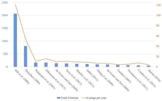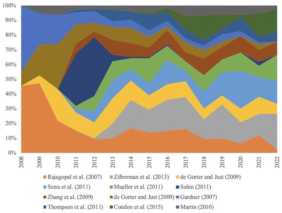 The discrepancy shown in Figure 6 justifies the removal of the studies proposed by [6,7] for the elaboration of Figure 7, whose objective is to present the distribution of citations over time of the most cited articles in the sample, complementing the information provided in the enumeration above. For example, authors such as Rajagopal et al. [35] de Gorter and Just [28,34] have high numbers of absolute citations but have lost their influence in more recent publications, given the reduction in citations per year. Another example is a study by [32], which received a large number of citations in 2011 and 2012, establishing itself among the most cited in the sample. However, in recent years, it has received a low number of citations. At the same time, other authors, such as [29,36], have maintained their influence in recent publications. Finally, ref. [12], and more recently ref. [13], has stood out in recent years.