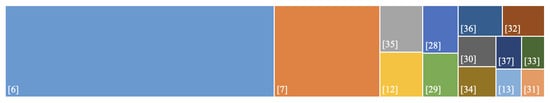 We consider a number of citations of each publication in Figure 6, where the Citation Treemap presents hierarchical data (structured tree) as a set of nested rectangles. The area of each rectangle is proportional to the number of citations the manuscript has in the sample. This map aims to visually represent the disproportion in the number of citations of the two most cited articles in the sample and the other included studies.