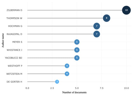 Differently from the previous graphs that were dedicated to publications, Figure 8 presents the authors or co-authors (individually) most representative in the sample with the largest number of publications. Among these, Zilberman D. and Thompson W. stand out, with ten and eight articles each, respectively. In the sequence, Hochman G., and Rajagopal D., present in seven publications each, are identified.