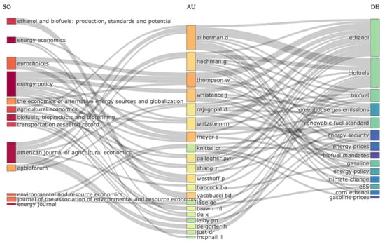 Figure 9 shows the tree-field plot, establishing relationships between the most frequent journals in the sample, the main authors, and the keywords. Thompson, one of the most relevant authors in the sample, has had his studies published in journals such as Energy Policy, Eurochoices, and The Economics of Alternative Energy Sources and Globalization. This author has used terms such as “ethanol”, “greenhouse gas emissions”, “renewable fuel standard”, “biofuel mandates”, and “gasoline” as keywords in his studies. From the same perspective, Zilberman, another relevant author on the topic, has published in journals such as Agricultural Economics, the American Journal of Agricultural Economics, and Agbioforum. The main keywords included in his works are “biofuels”, “greenhouse gas emissions”, “energy prices”, “energy policy”, “climate change”, and “corn ethanol”.